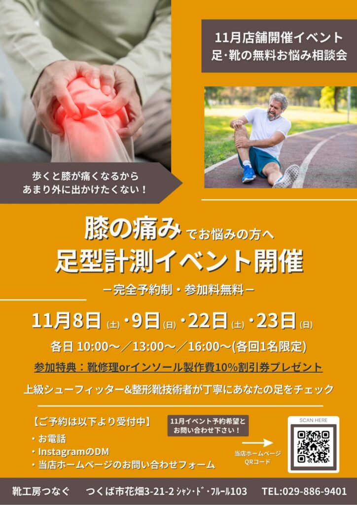 当店では膝の痛みでお悩みの方へ足の健康チェック無料足型計測イベントを開催します。