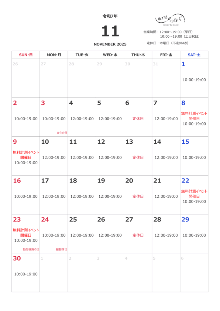 お知らせ2025年10月31日靴工房つなぐ11月の営業日のご案内 お知らせ2025年10月31日靴工房つなぐ11月の営業日のご案内